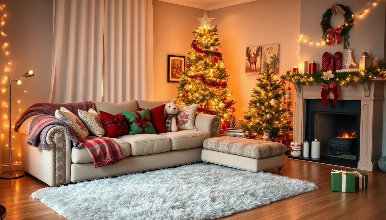 Cozy Christmas living room with festive decorations and warm ambiance.