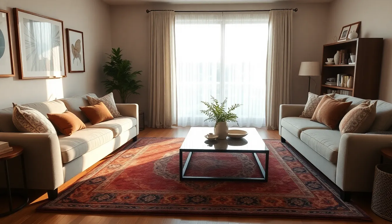 Using area rugs offers multiple benefits that augment a living room’s appeal. Rugs provide comfort underfoot, enhancing relaxation in the space. They also reduce noise levels by absorbing sound, creating a quieter atmosphere. Area rugs protect flooring from wear and tear while adding layers to the decor. Their versatility allows for easy updates to the room’s look. Easy maintenance makes them practical choices for busy households.