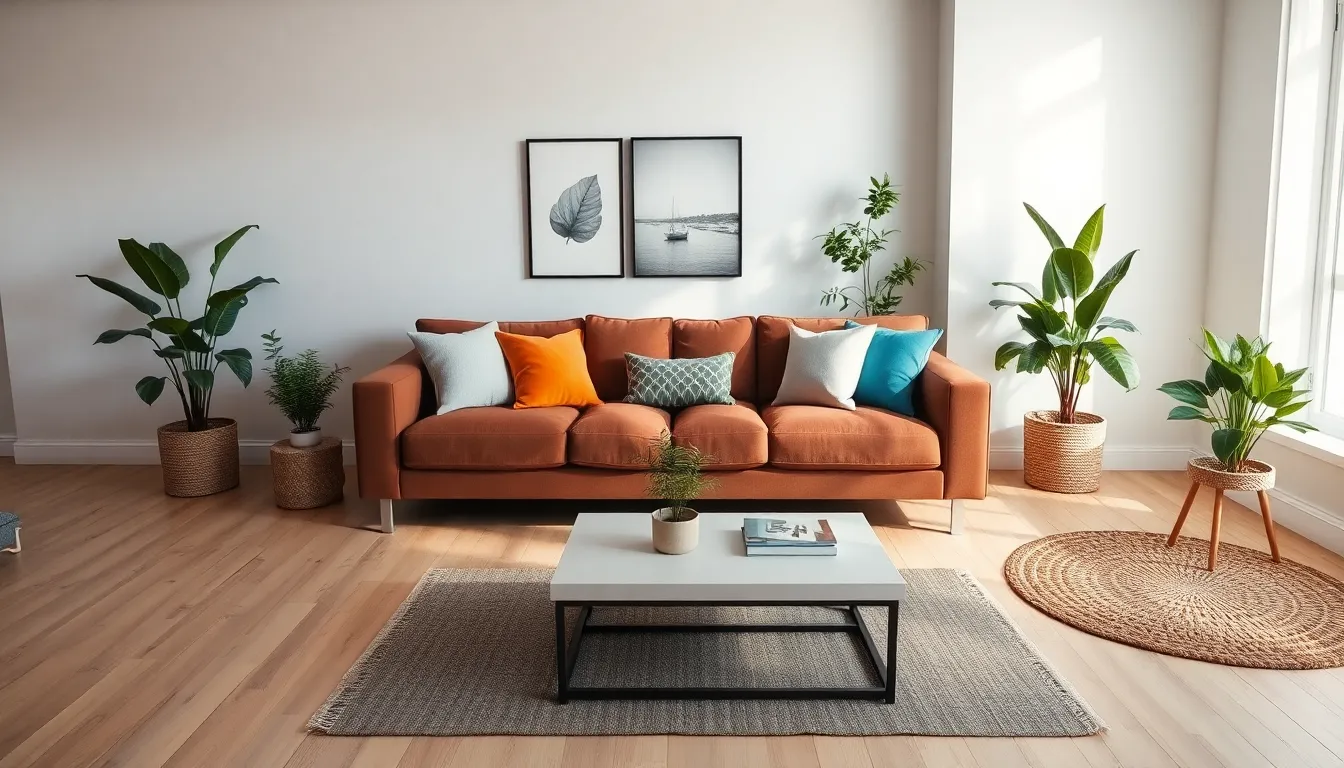 Modern living rooms often utilize brown sofas to bring warmth and sophistication. Minimalist aesthetics shine with clean lines and neutral palettes, where a brown sofa acts as an anchor. Colorful throw pillows and geometric patterns complement sleek furniture. Light wood flooring enhances the room’s brightness, while strategically placed plants bring life to the decor. Open layouts encourage easy movement and interaction, making gatherings more enjoyable.